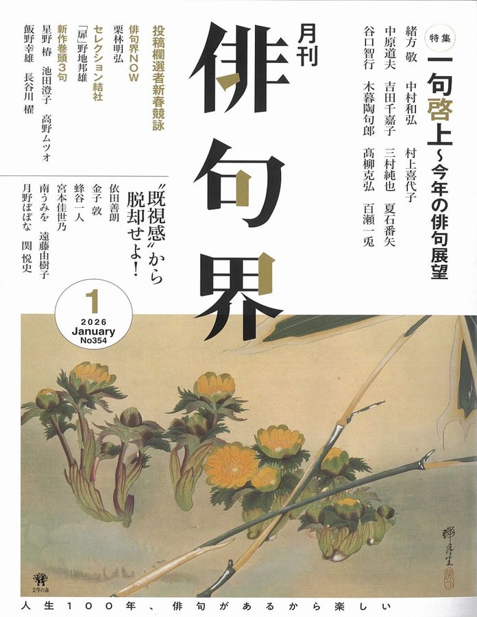 最新号 月刊 俳句界 2026年1月号 毎月25日発売/A5判/定価1,000円 Amazonで購入する 大特集 一句啓上 ~今年の俳句展望~ 特集 “既視感”から脱却せよ! 俳句界NOW栗林明弘 セレクション結社「扉」野地邦雄 新作巻頭3句星野椿/池田澄子/高野ムツオ/飯野幸雄/長谷川櫂 注目の句集渡井一峰「平明」
