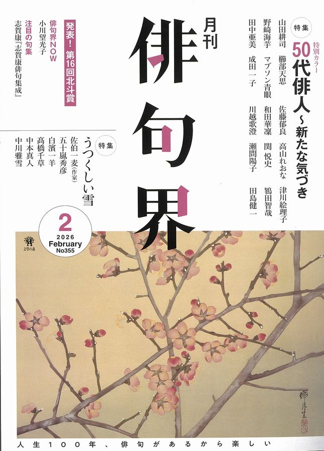 月刊 俳句界 2026年2月号 毎月25日発売/A5判/定価1,000円 Amazonで購入する 大特集 50代俳人 ~新たな気づき~ 特集 うつくしい雪 俳句界NOW小川望光子 新作巻頭3句井上弘子/前田弘子/ふけとしこ/福島せいぎ/山下幸典 注目の句集志賀康「志賀康俳句集成」